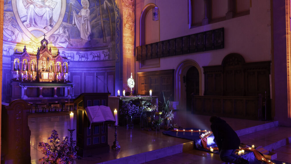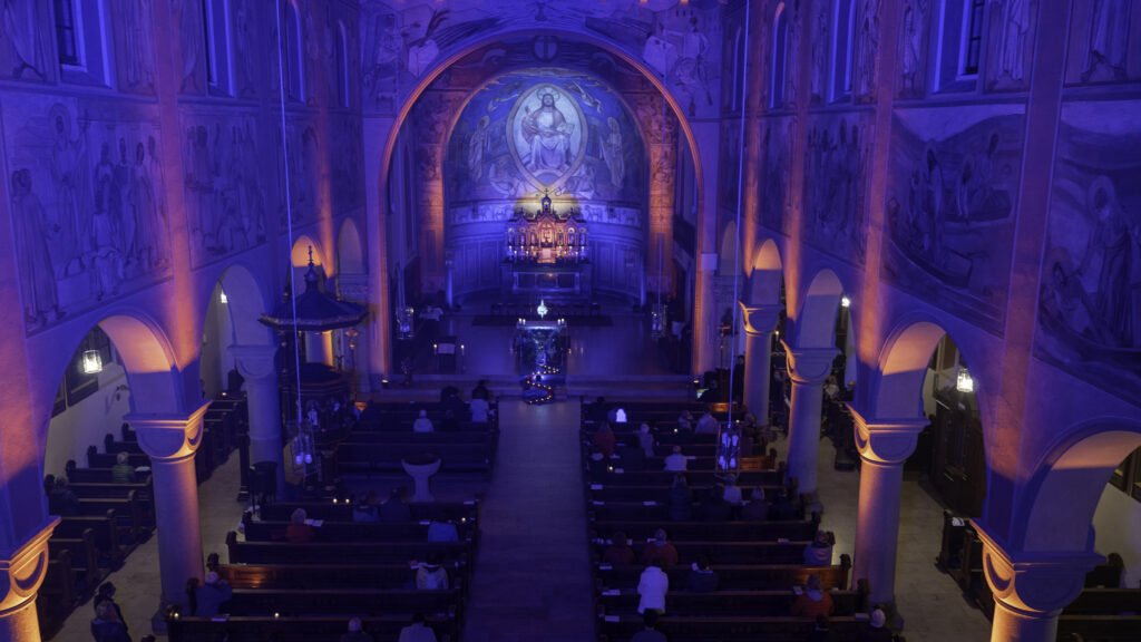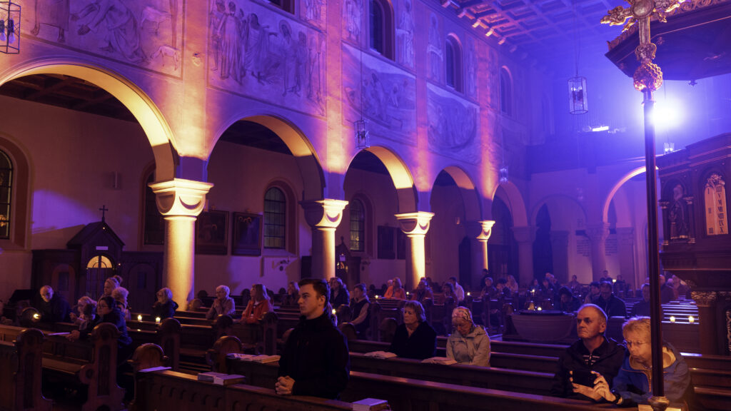 Einen geistlichen „Lagerfeuerabend“, um sich die Barmherzigkeit Gottes neu schenken zu lassen, haben Priesterseminar und Pfarrverband Esting-Olching gemeinsam gestaltet: Eine fantastische Ausleuchtung der Pfarrkirche St. Peter und Paul gab den einladenden optischen Rahmen. Ein Gedanke aus dem 2. Timotheusbrief bereitete das Motiv für die Eucharistiefeier und den weiteren Abend: „Entfache die Gnade Gottes wieder!“ Möglichkeiten, die Gnade Gottes neu zu erbitten, bot die anschließende Gebetszeit reichlich: Die Mitfeiernden konnten Lichter in den Altarraum tragen, Bibelworte für sich ziehen; sie konnten Gesprächsmöglichkeiten und Beichtangebot nutzen oder auch persönlich für sich das Gebet erbitten. Schwungvolle Lobpreismusik und vertiefende geistliche Impulse gaben immer wieder neu Anregungen zum Nachdenken und zum Gebet.